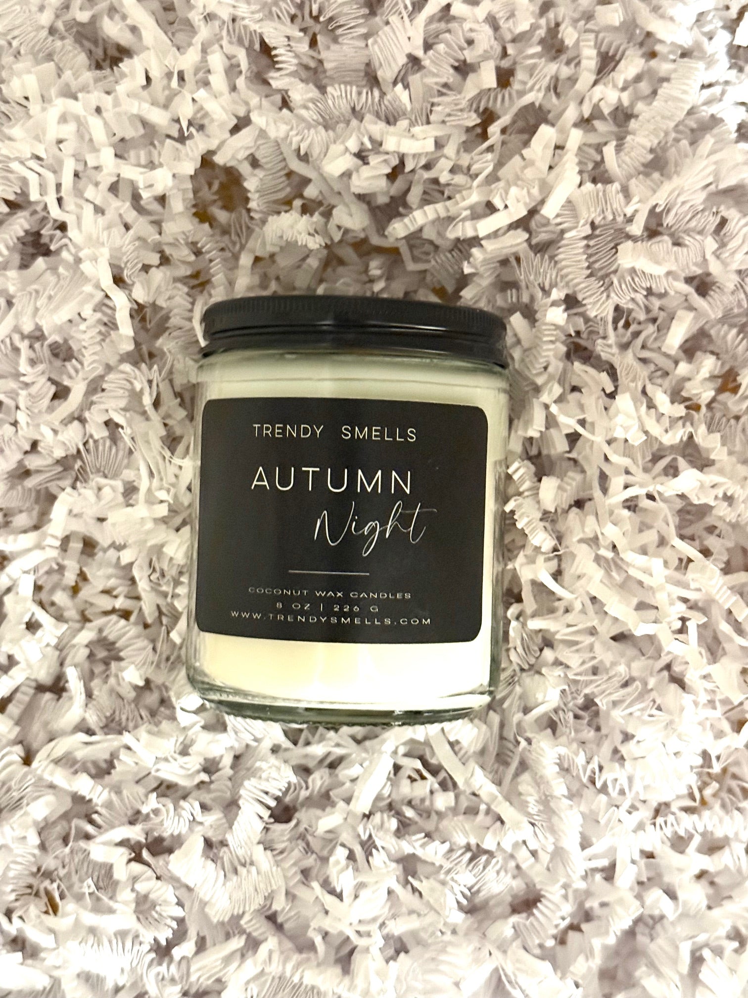 Our premium wood wick candle boasts a captivating Autumn Night scent, impressive burn time, and environmentally friendly coconut wax, all in a sleek glass jar.
