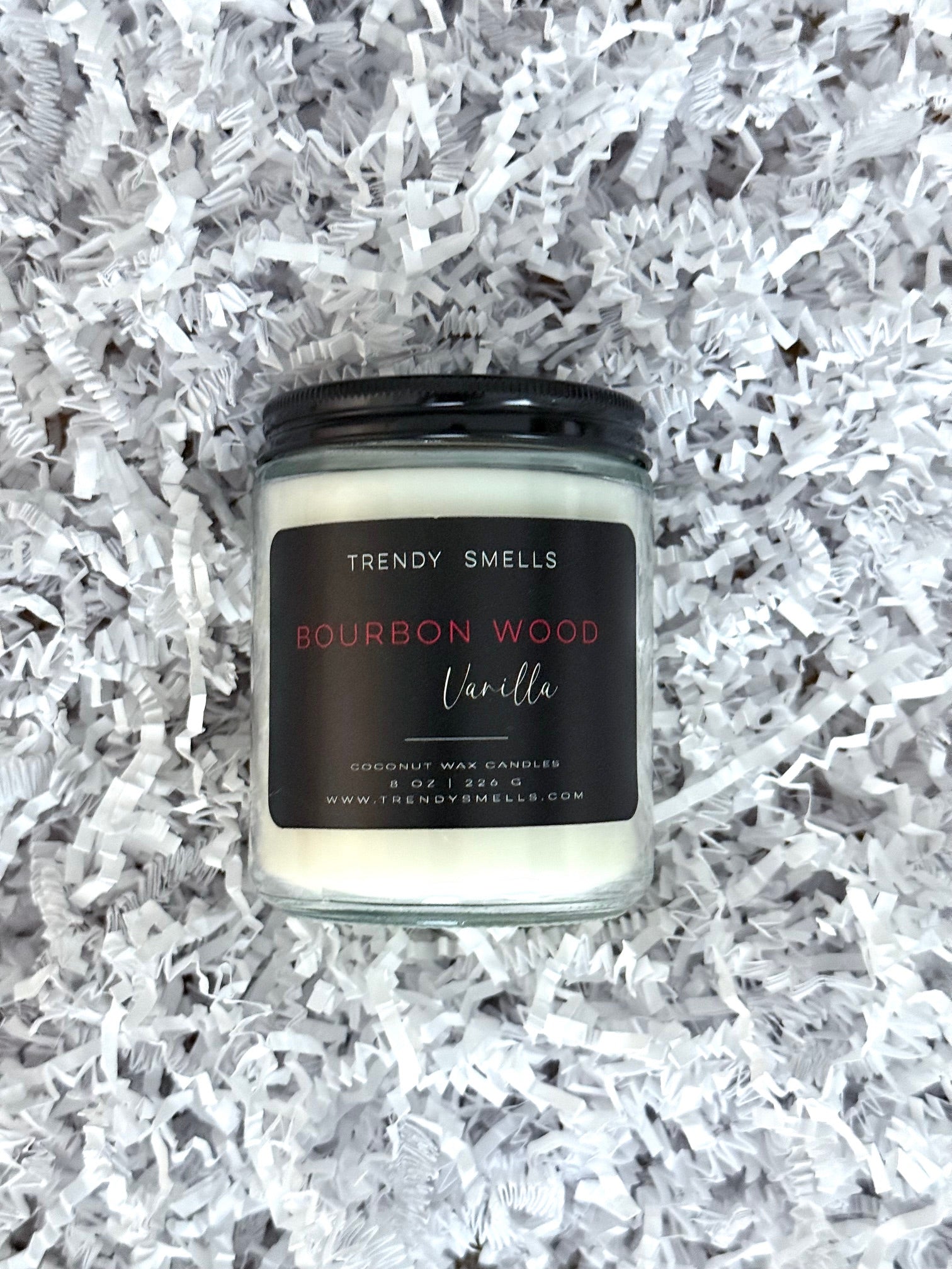 Our premium wood wick candle boasts a captivating Bourbon Wood Vanilla scent, impressive burn time, and environmentally friendly coconut wax, all in a sleek glass jar.