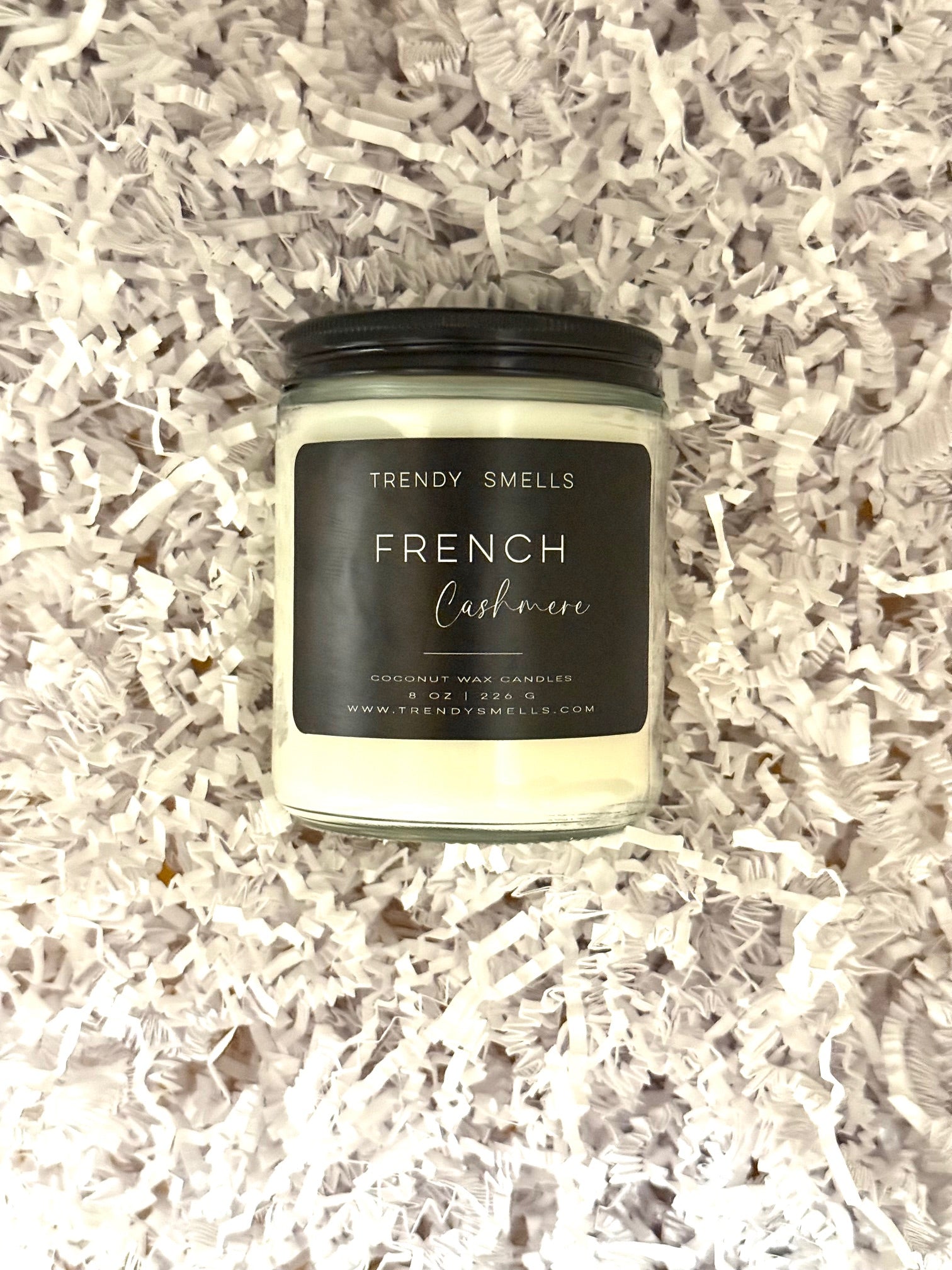 Our premium wood wick candle boasts a captivating French Cashmere scent, impressive burn time, and environmentally friendly coconut wax, all in a sleek glass jar.