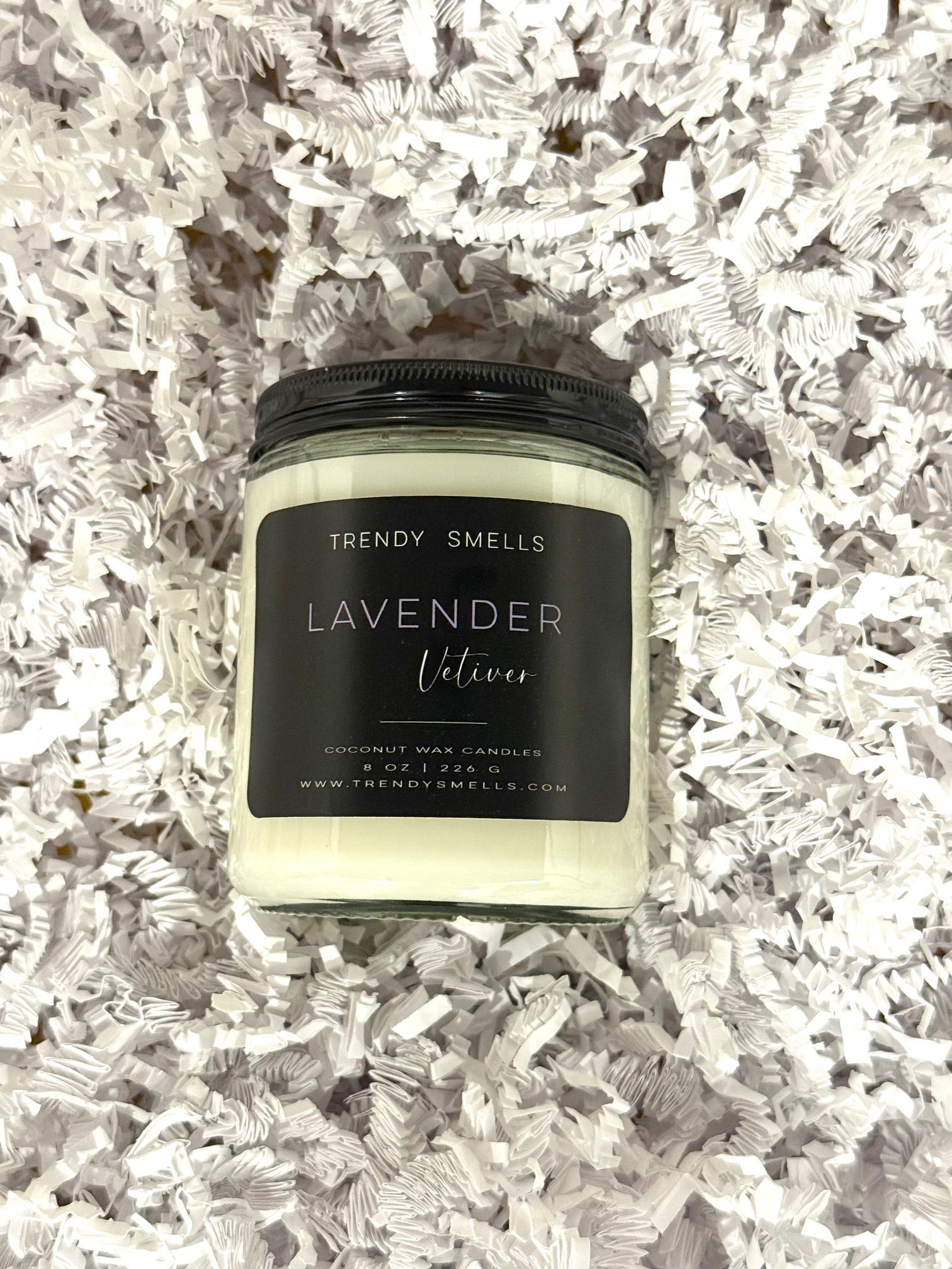 Our premium wood wick candle boasts a captivating Lavender Vetiver scent, impressive burn time, and environmentally friendly coconut wax, all in a sleek glass jar.